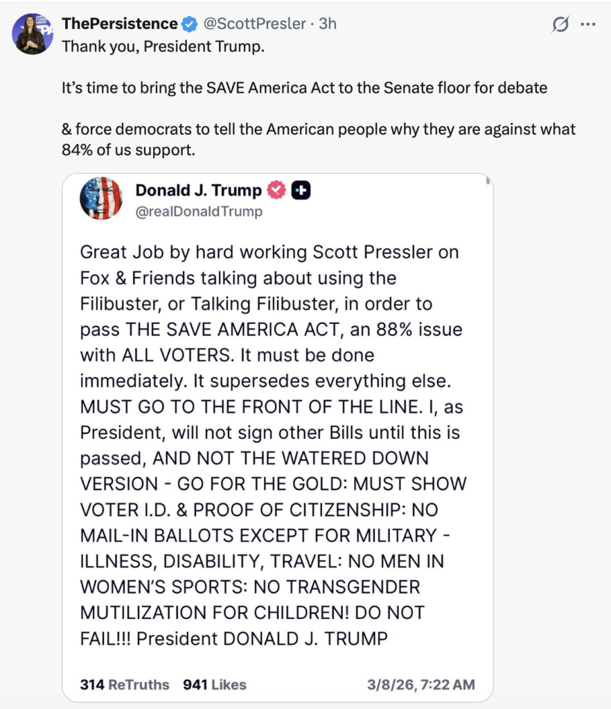 “Great Job by hard working Scott Pressler on Fox & Friends talking about using the Filibuster, or Talking Filibuster, in order to pass THE SAVE AMERICA ACT,” Trump wrote — misspelling Presler’s name in the process.